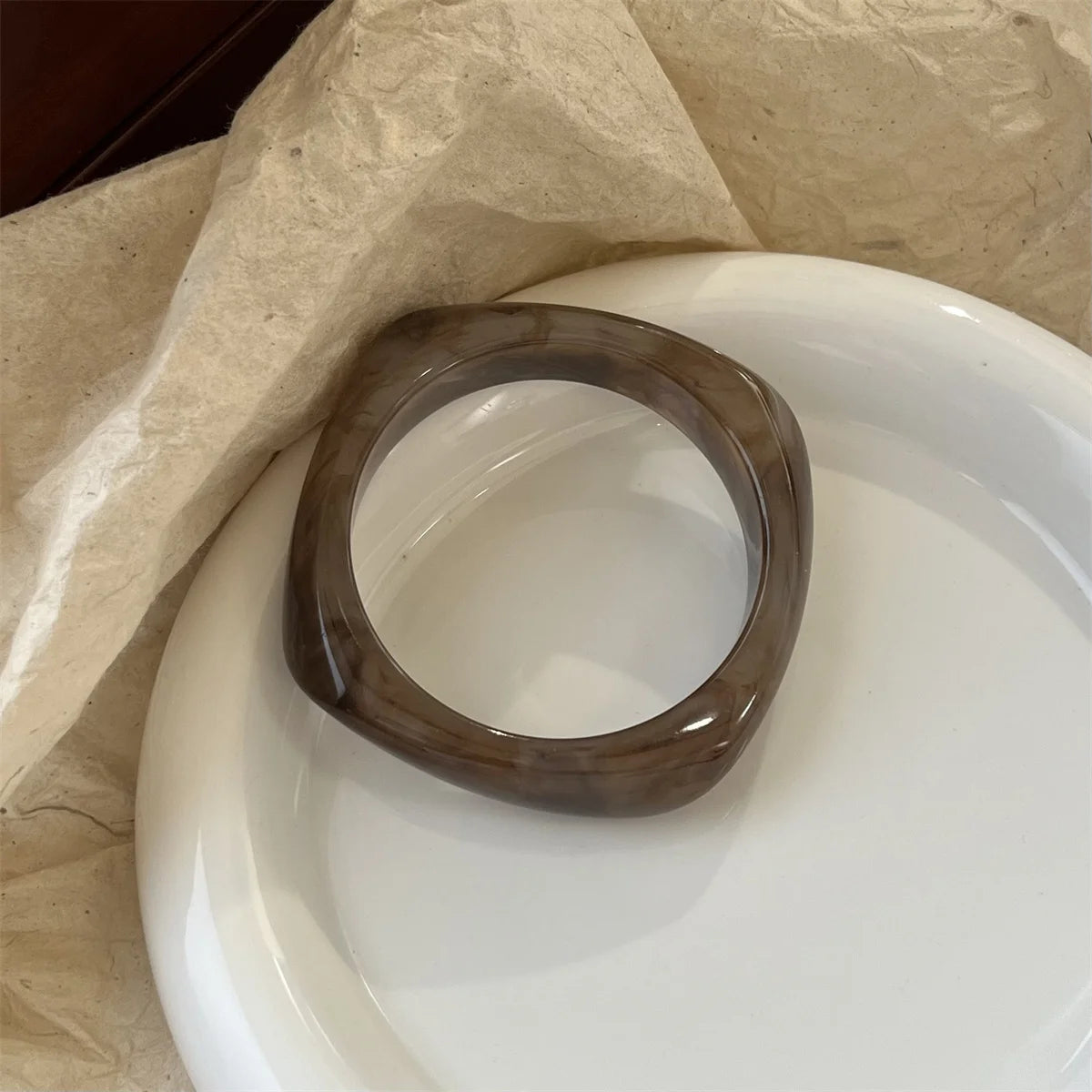 Crafted from high-quality acrylic resin, its substantial feel and smooth polish create a sculptural presence on the wrist—making it a standout accessory whether worn alone or stacked.